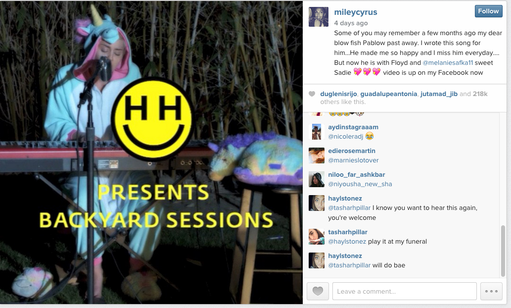 Learn to express your grief via Miley Cyrus on Instagram: “Some of you may remember a few months ago my dear blow fish Pablow past away. I wrote this song for him…He made me so happy and I miss him everyday….”