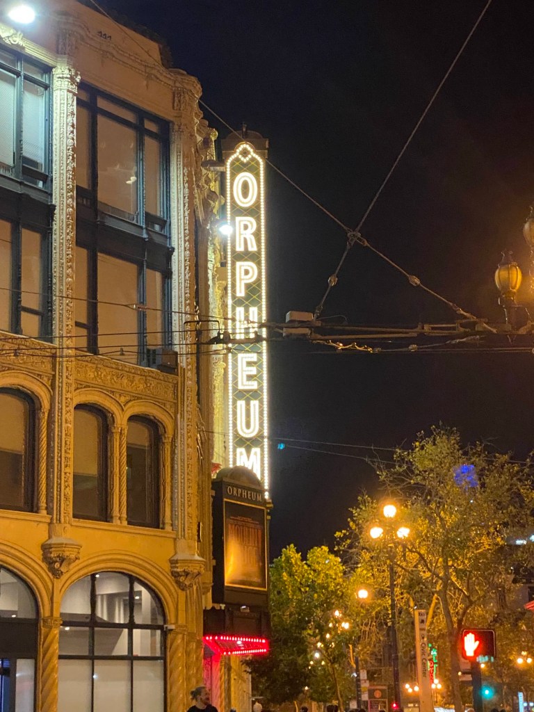 Not so at the Orpheum. All manner of libations were carried into the theatre including entire bottles of wines. Bold choice, Orpheum, bold choice. I was honestly a bit concerned that the happy party (rEaLly hApPy hic) in the front row of the balcony was going to drop one of those bottles over the ledge, if not fall over themselves. I don’t know how drunk you need to get to enjoy a show, but Karen and Ken who were sitting behind them were very annoyed. They were annoyed enough for all of us so I didn’t have to be. Good looking out Karen and Ken. Then they took their indignance to the empty seats right in front of us and proceeded to tongue click and sigh in exasperation almost as loudly as the hApPy pArTy was enjoying themselves. I’m just the kinda girl who finds this wildly amusing. So I enjoyed a little live theatre within a show about live theatre…Oh my, the dish. So much juice.